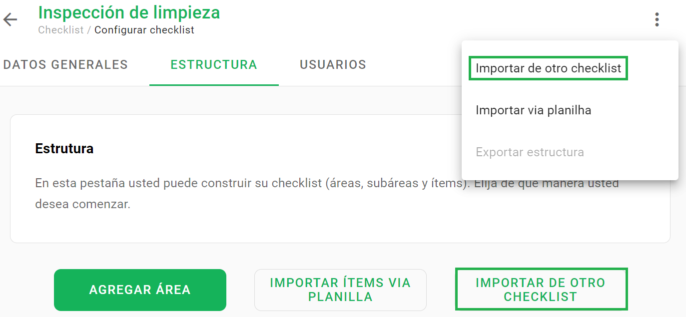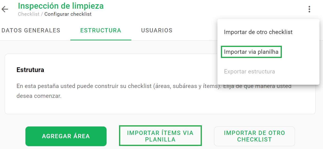 - Importar vía planilha: en la pestaña Estructura, puede importar un checklist vía planilha directamente. Haga clic en el icono resaltado abajo y seleccione "Importar via planilha".