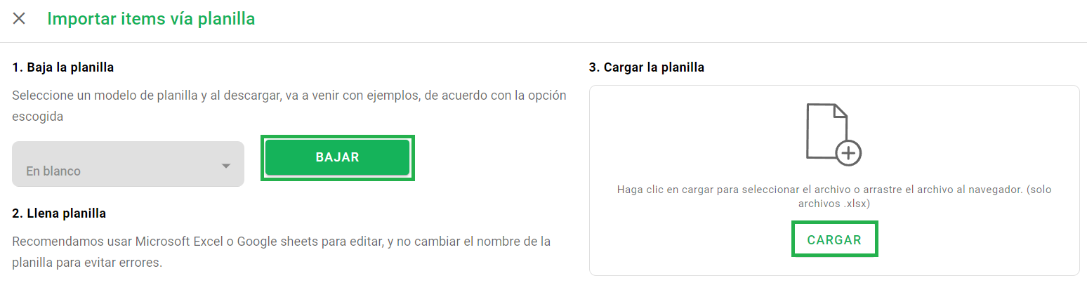 Serás redirigido a una nueva página donde podrás bajar una plantilla de planilha en blanco. Recomendamos utilizar Microsoft Excel o Google Sheets.