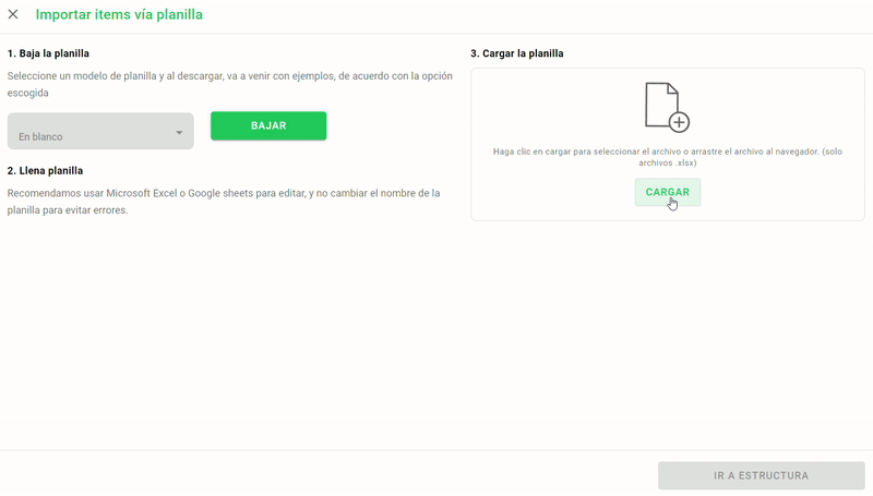 Con la planilha completa, haga clic en "Cargar" y seleccione "Iniciar importación". Cuando aparezca "Concluido", haga clic en "Ir a estructura".