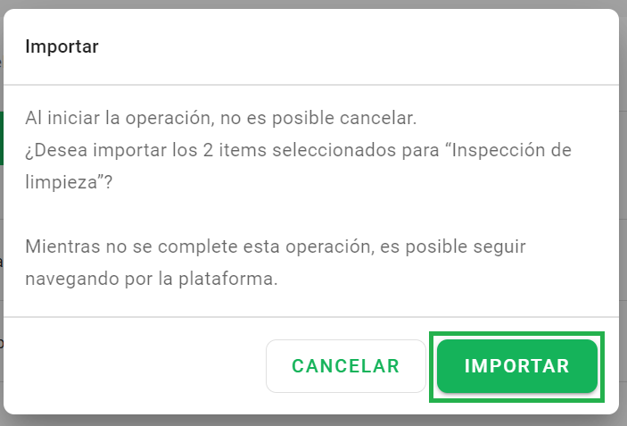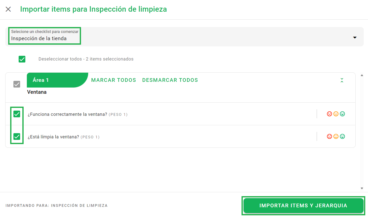 Seleccione el checklist y luego los ítems que importará. Por último, haga clic en el botón "Importar items y jerarquía".