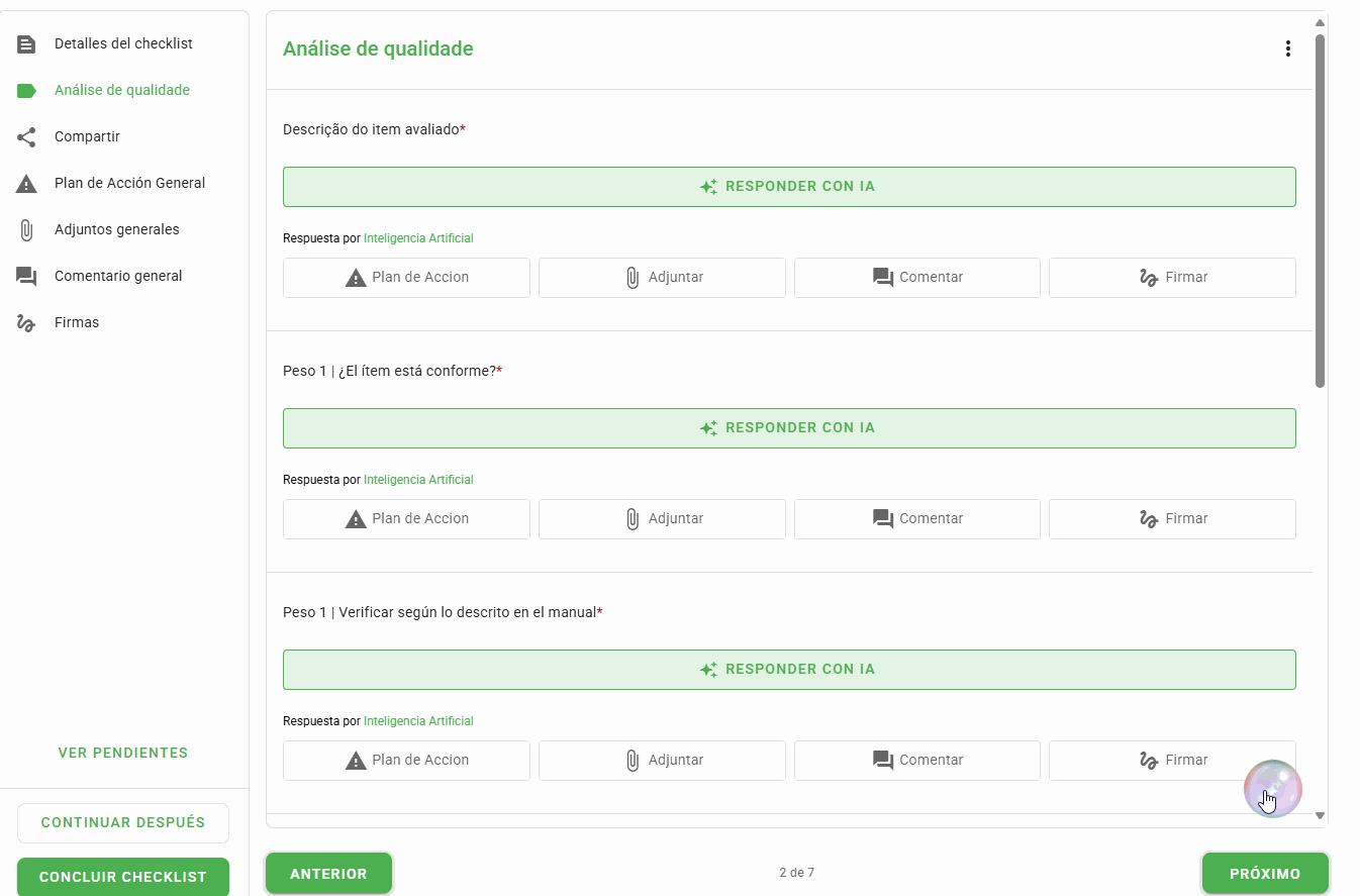 Si un ítem tiene activada la opción de bloquear la edición, la respuesta de la IA es definitiva para el auditor. Si identifica un error constante, contacte a su gestor para ajustar la configuración de la IA en la estructura del checklist.