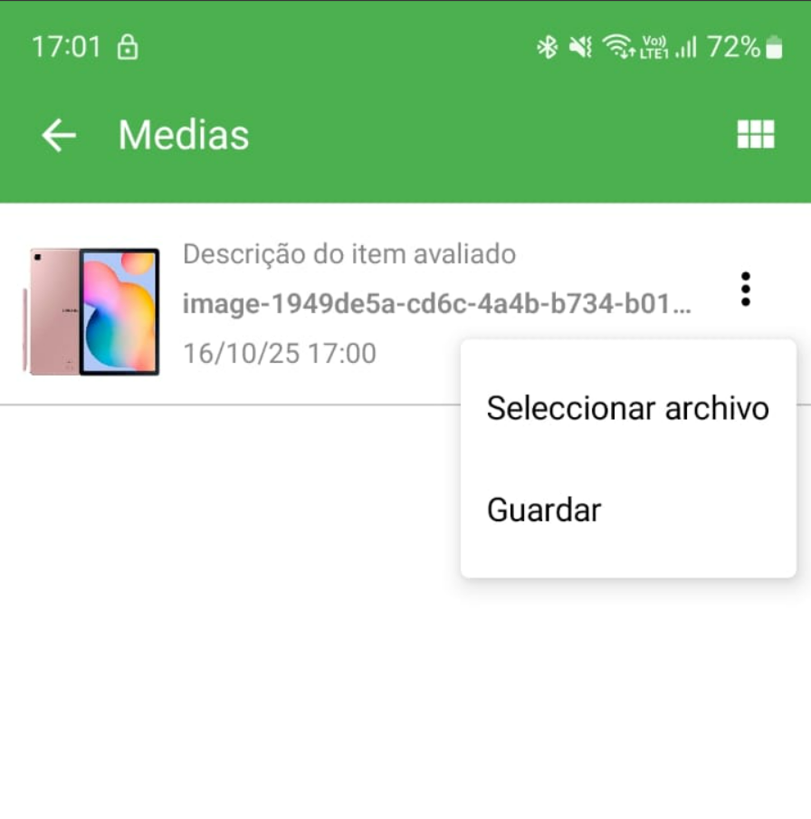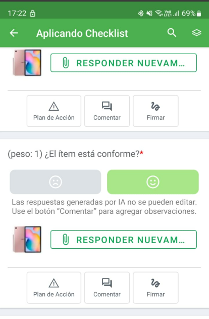 - Reutilizar: En la galería de imágenes del checklist, use los tres puntos sobre una foto ya cargada y elija "Seleccionar archivo" para analizarla en otro ítem.