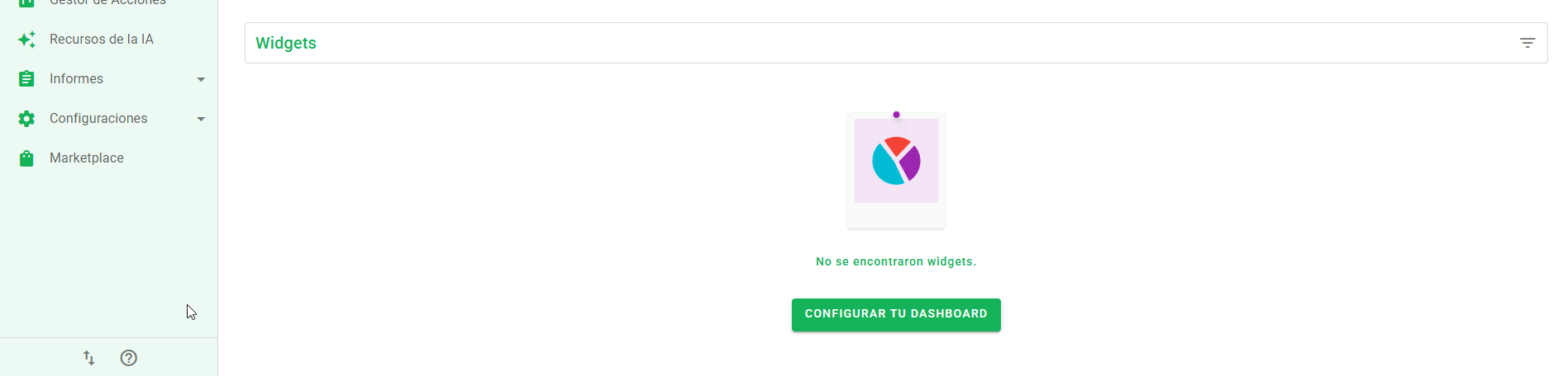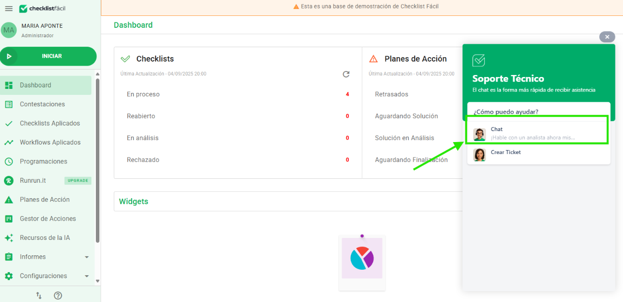 Puede acceder al chat desde dentro del sistema. Basta con hacer clic en el botón ? en el menú lateral y, a continuación, seleccionar la opción Chat. El widget de atención se mostrará en el lado derecho de la pantalla.
