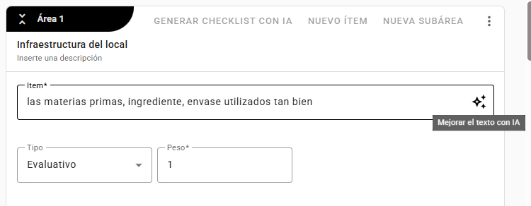 La funcionalidad de mejora de texto con IA fue desarrollada para facilitar la creación y edición de ítems dentro de la estructura del checklist, permitiendo que los usuarios realicen mejoras y correcciones en las descripciones de manera simple y eficaz.