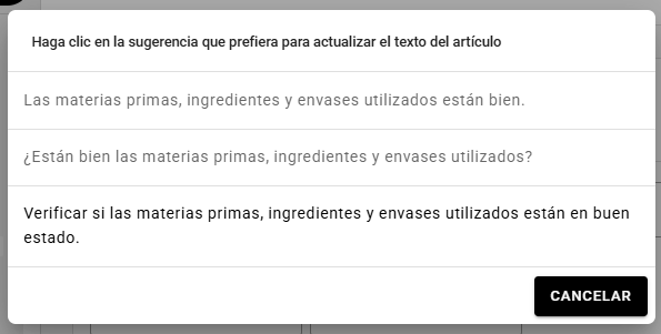 Se trata de un asistente de texto con inteligencia artificial que ayuda a redactar la descripción de los ítems del checklist, ofreciendo sugerencias automáticas basadas en el contenido escrito. Esto permite agilizar la configuración de los cuestionarios y asegurar una mayor estandarización en la redacción.