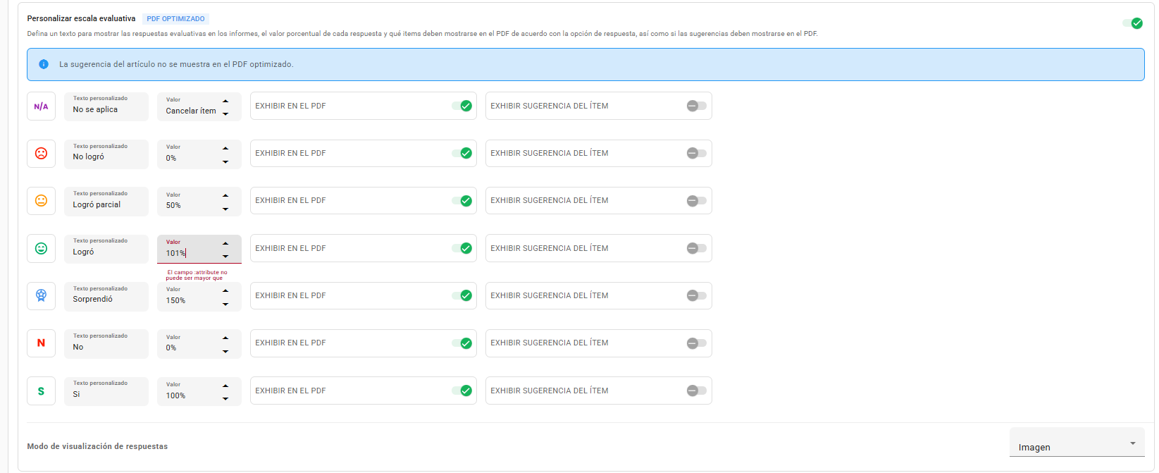 Recientemente liberamos la posibilidad de configurar un valor para la medalla superior al 100 %. Esta funcionalidad no está disponible para las otras opciones de la escala evaluativa (NA, caritas, Sí y No), como se muestra en la siguiente imagen:
