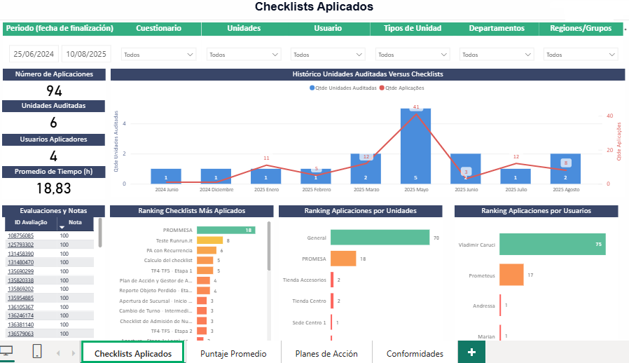 En la pestaña Checklists aplicados, podrá visualizar todo lo relacionado con el tema, como las unidades donde se aplicó, los usuarios, la cantidad de aplicaciones, además de poder agregar filtros para segmentar la búsqueda.