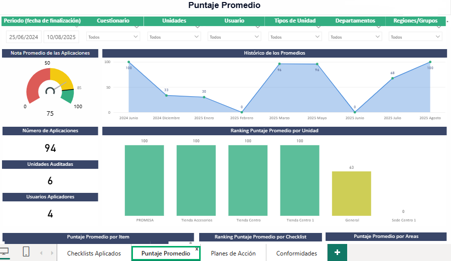 En la pestaña Puntaje Promedio, es posible obtener información sobre las calificaciones de los checklists, como un seguimiento detallado de los promedios por unidad, aplicaciones, usuarios, departamentos, entre otros.