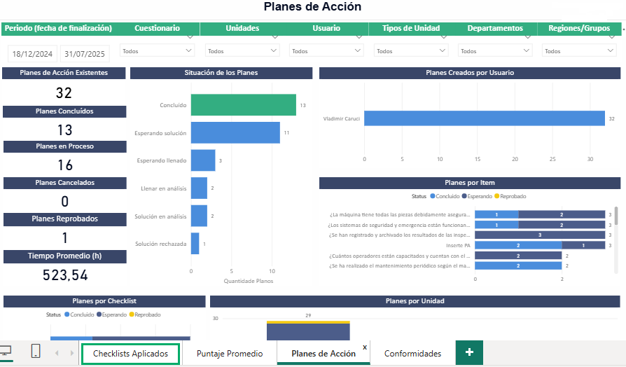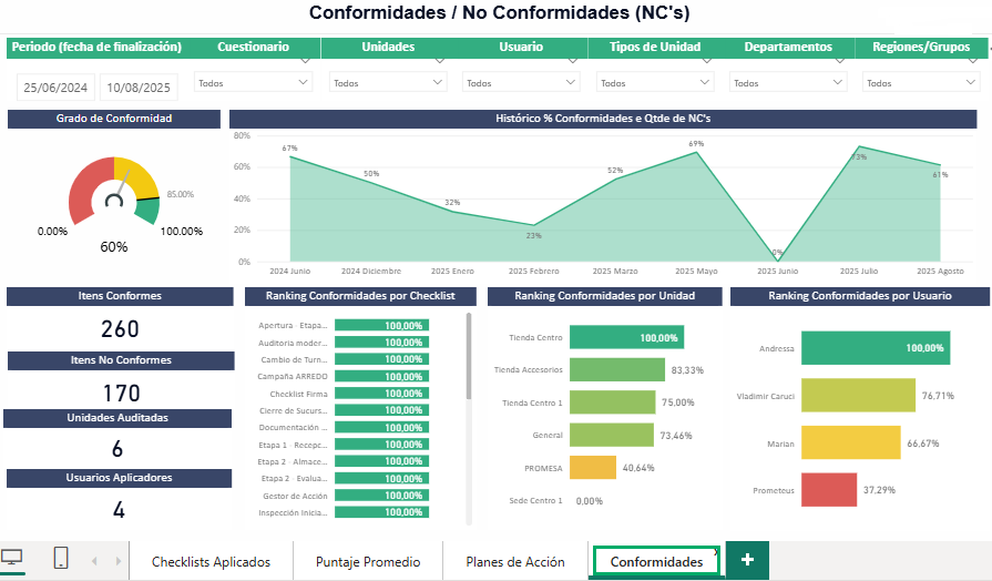 Por último, en la pestaña Conformidades, es posible obtener información sobre las conformidades y no conformidades encontradas durante la aplicación de checklists, así como su relación por unidad y usuario, por ejemplo.