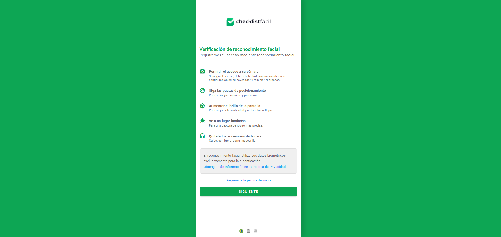 Al hacer clic en el botón Configurar acceso en el correo electrónico recibido, o en el próximo acceso al sistema, el usuario será redirigido a una pantalla con instrucciones antes de iniciar la captura facial. En esta etapa, se orientará al usuario a buscar un ambiente bien iluminado y seguir las instrucciones al pie de la letra.