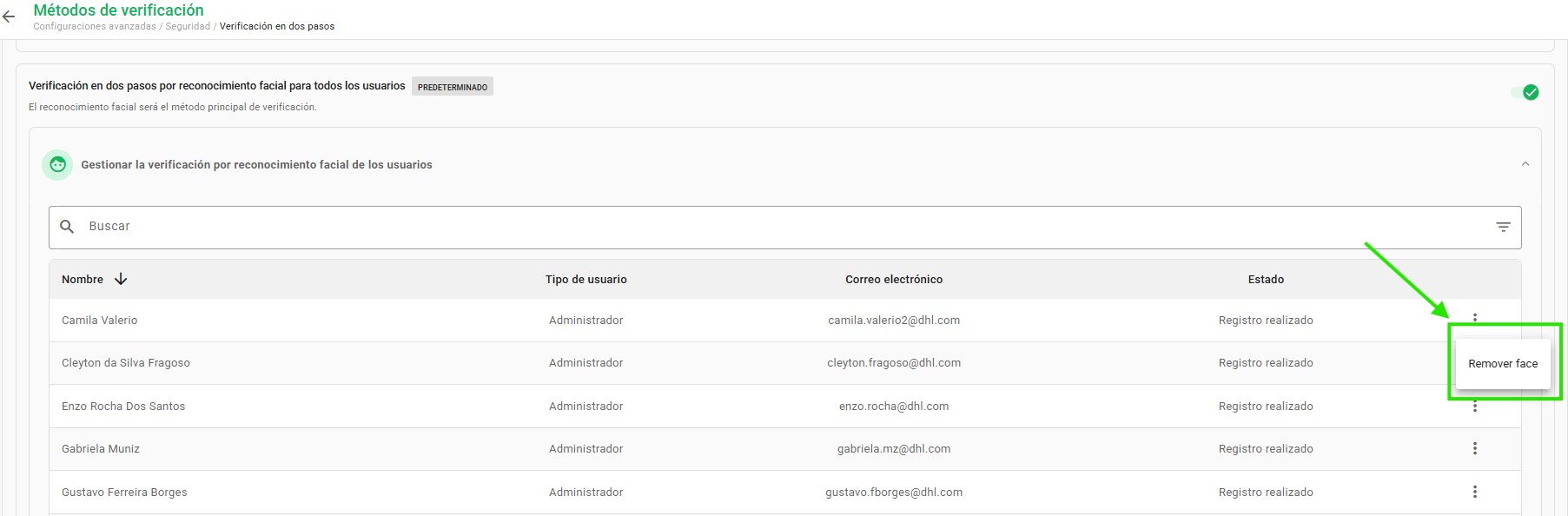 En la pantalla de Métodos de verificación (Configuraciones > Configuraciones avanzadas > Seguridad > Verificación en dos pasos), con el cuadro Gestionar la verificación por reconocimiento facial de los usuarios expandido, es posible eliminar el rostro registrado de un usuario haciendo clic en los tres puntos al lado derecho del usuario deseado y luego en Eliminar rostro.