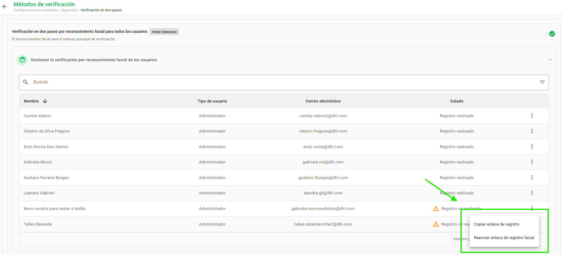 Si el usuario aún no ha registrado su rostro para el reconocimiento facial, es posible reenviar el enlace para el registro por correo electrónico o copiar el enlace para enviárselo manualmente.