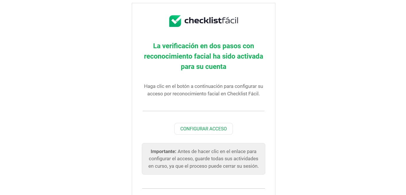 Con la activación de la funcionalidad de Verificación en dos pasos para todos los usuarios, junto con la opción de Verificación en dos pasos por reconocimiento facial para todos los usuarios. , cada usuario deberá configurar su acceso a través del reconocimiento facial. Esto puede realizarse mediante el enlace enviado por correo electrónico al momento de la activación de la funcionalidad, que se envía a todos los usuarios registrados, o en el próximo inicio de sesión en el sistema.
