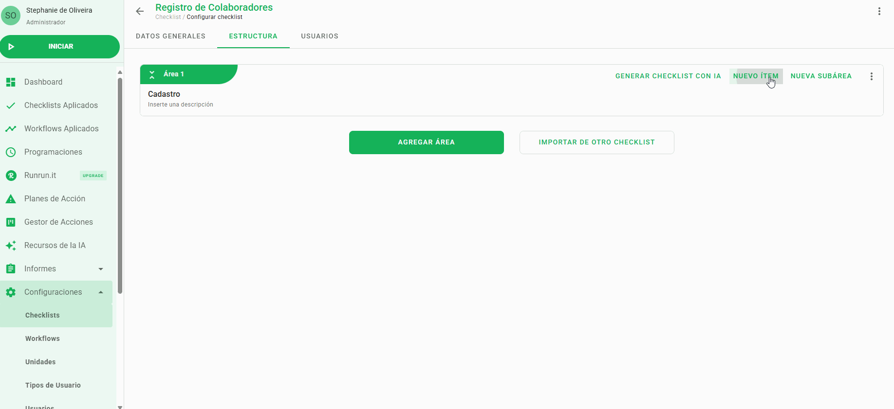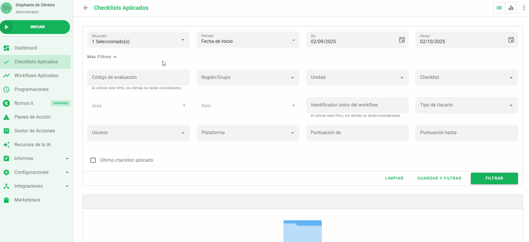 - Filtre por Checklist, Área e Ítem (el que está vinculado al catálogo).