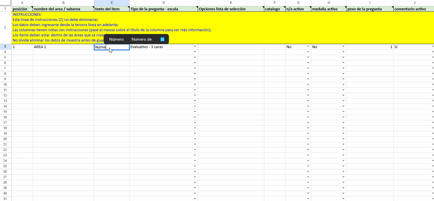 - En la columna "Tipo de la pregunta - escala", use la opción "Especial - Catálogos - Selección única".