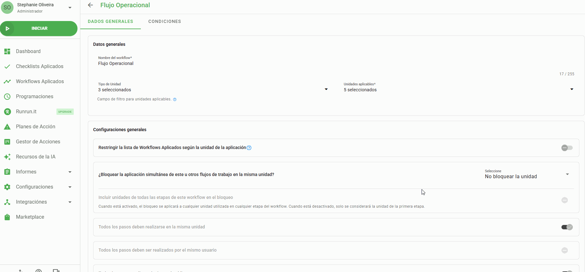 Abre la pantalla de edición del workflow (nuevo o existente) y localiza la opción: ¿Bloquear la aplicación simultánea de este u otros workflows en la misma unidad?