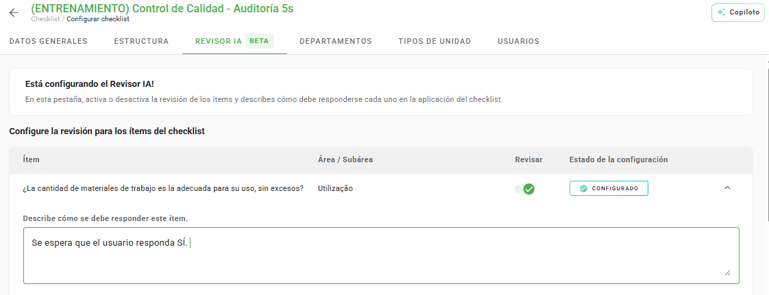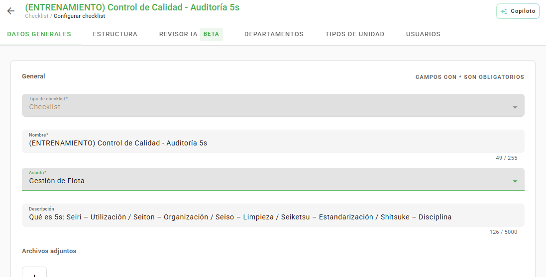 - Acceda a la configuración de un checklist (nuevo o existente).