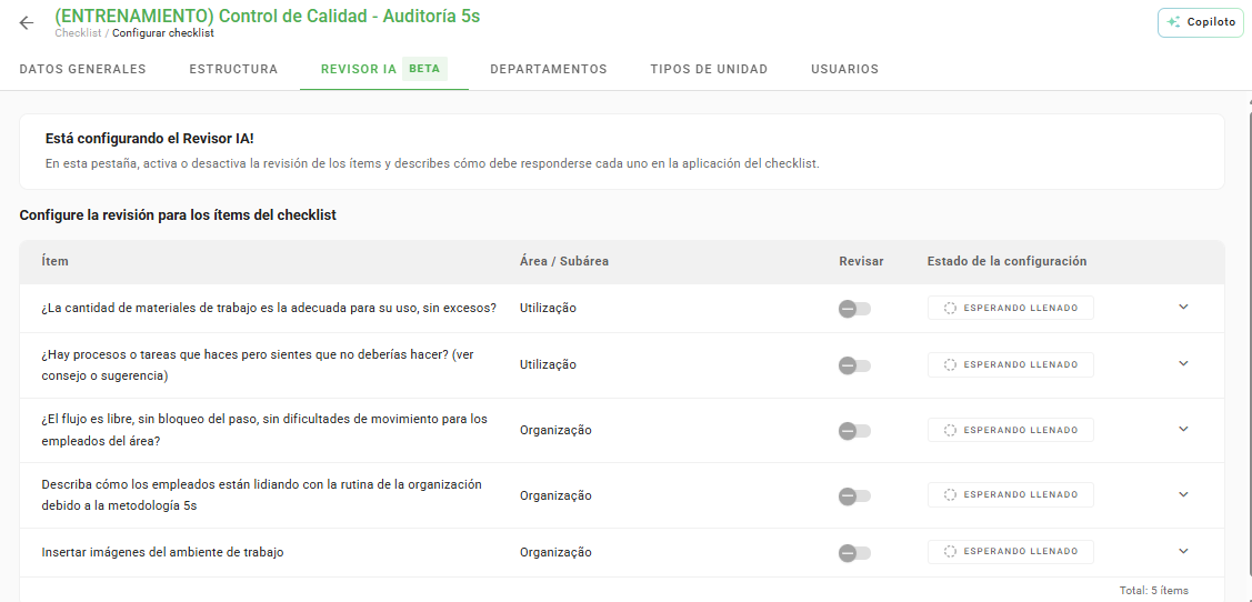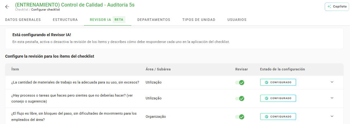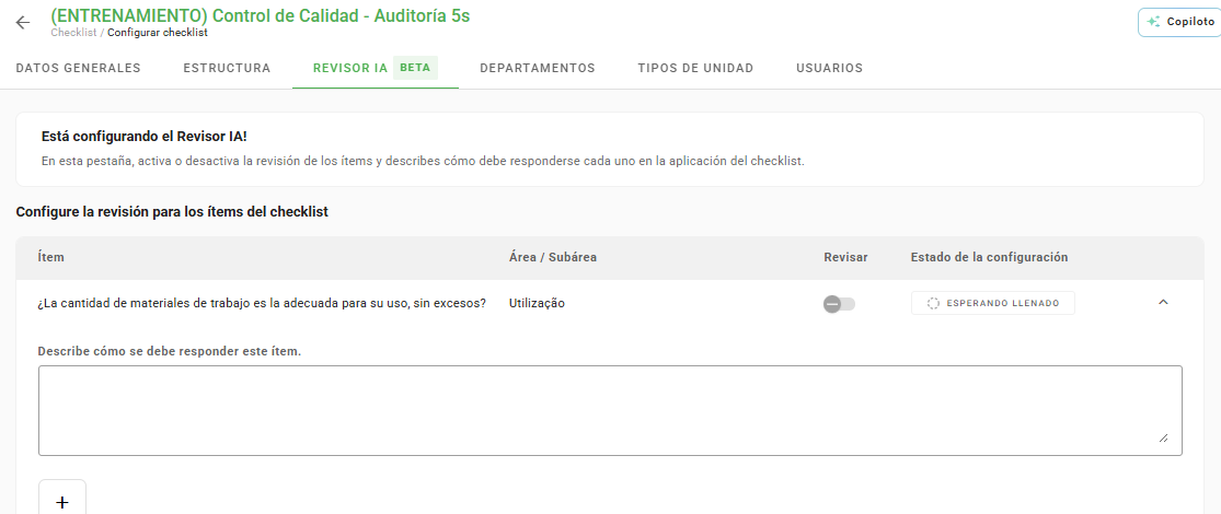 Al acceder a la pestaña Revisor IA, usted verá la lista de todos los ítems de su checklist. Usted tiene la flexibilidad de elegir cuáles y cuántos ítems desea que la IA audite.