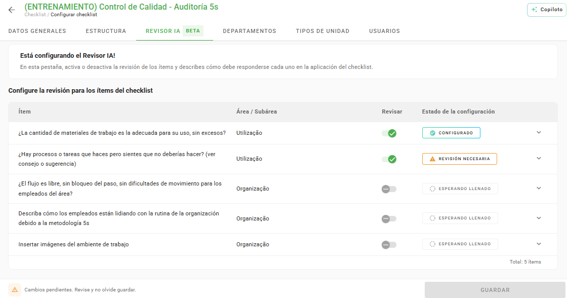 Es necesario tener al menos 1 ítem creado en el checklist para realizar la configuración.