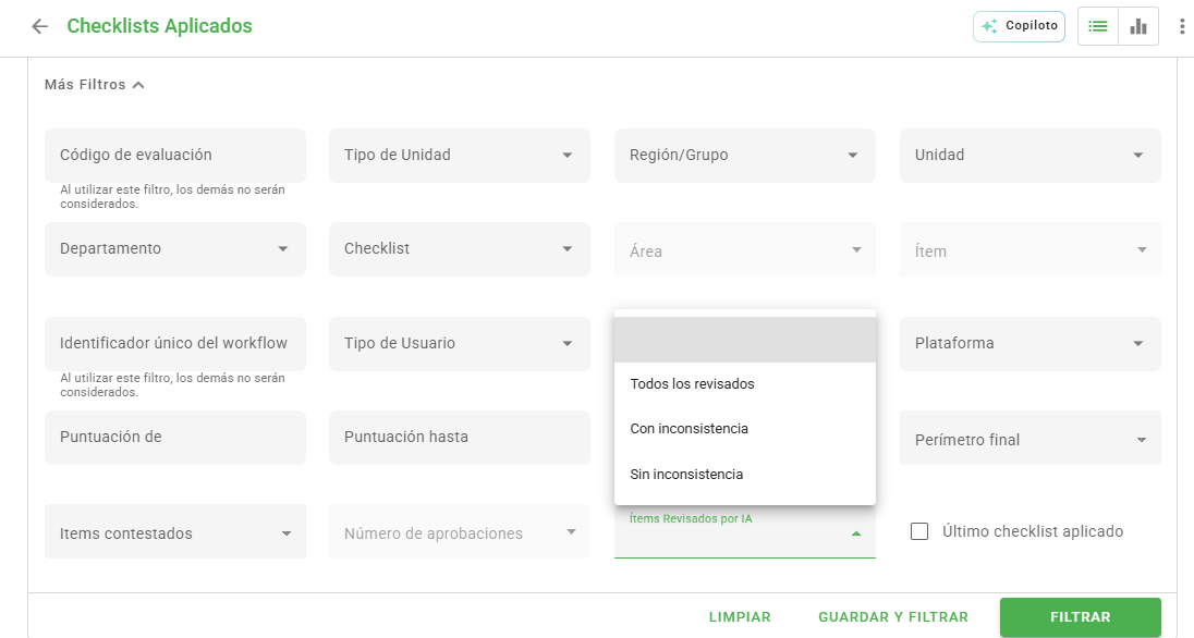 Es posible también realizar un filtro para visualizar solo checklists auditados, con o sin inconsistencias.
