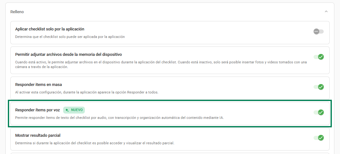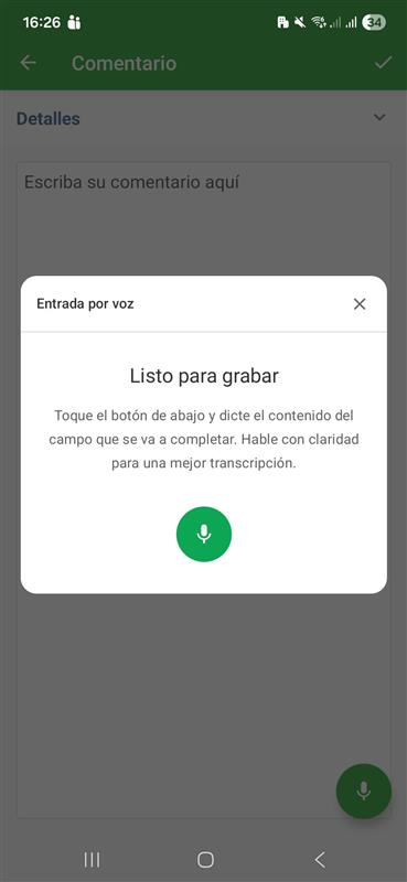 Al abrir un Checklist configurado, usted verá un ícono de micrófono al lado derecho de los campos elegibles. El flujo de uso es sencillo: