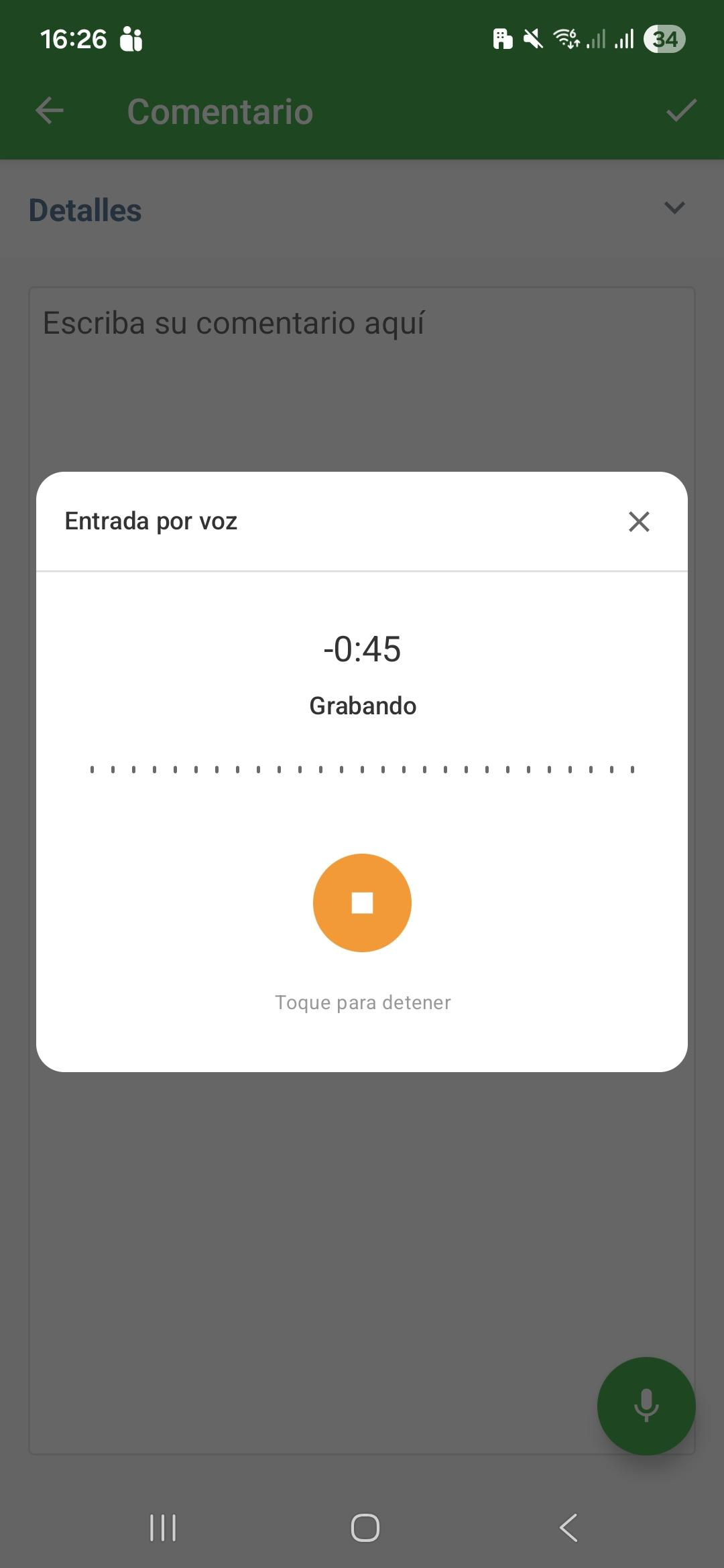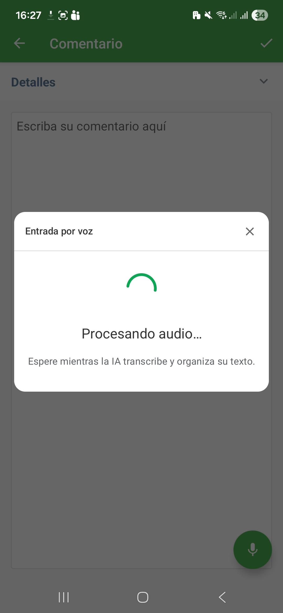 Aviso: La transcripción por voz depende de la conexión a internet. En caso de inestabilidad, el procesamiento puede fallar. Verifique su conexón e intente nuevamente.