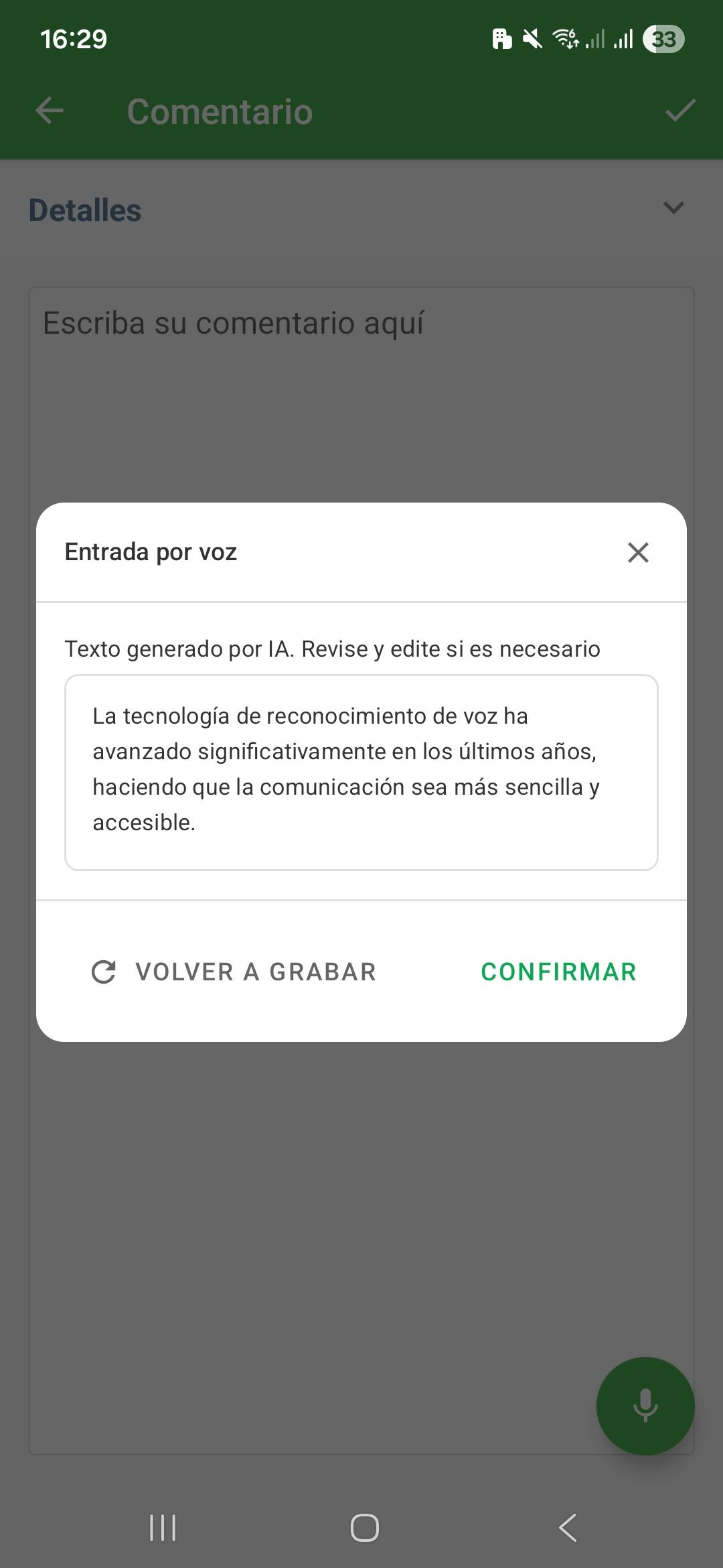 4. Revise y confirme: El texto aparecerá en la pantalla para su revisión. Usted puede editarlo manualmente o confirmar para que se inserte en el campo.