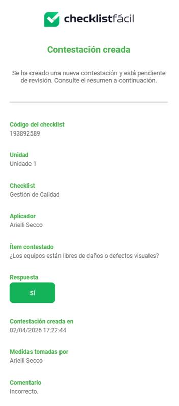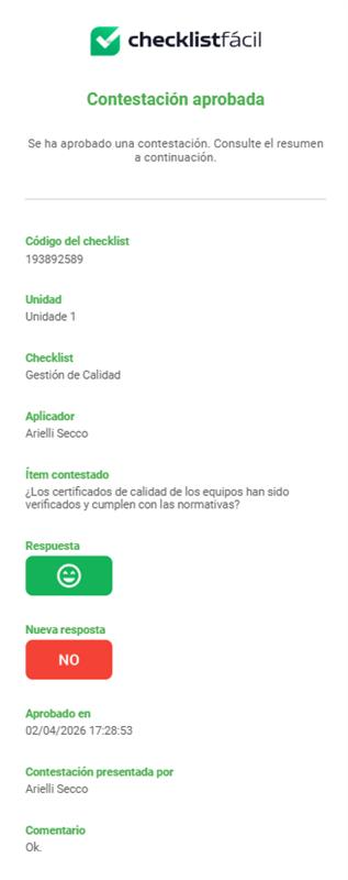 - Contestación creada: Notifica a los aprobadores vinculados al Checklist cuando se abre una nueva solicitud.