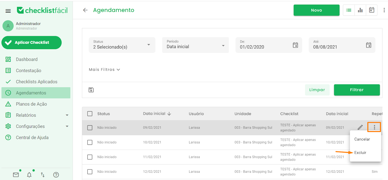 Para excluir um agendamento, basta clicar no ícone de três pontinhos à direita do item desejado e selecionar a opção Excluir.