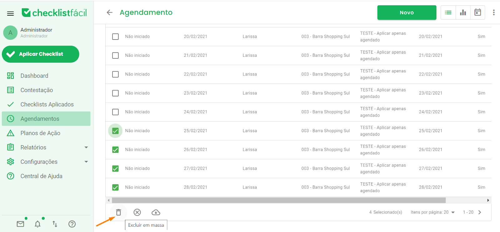 Se você possuir muitos agendamentos individuais (sem vínculo de repetição), é possível realizar a remoção de forma agilizada. Utilize a múltipla seleção na listagem e clique em Excluir em massa, botão disponível no rodapé da página.