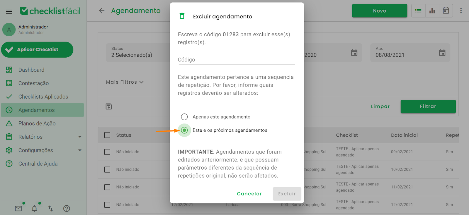 Atenção: Quando um agendamento é excluído, não é mais possível acompanhar o seu histórico no sistema.
