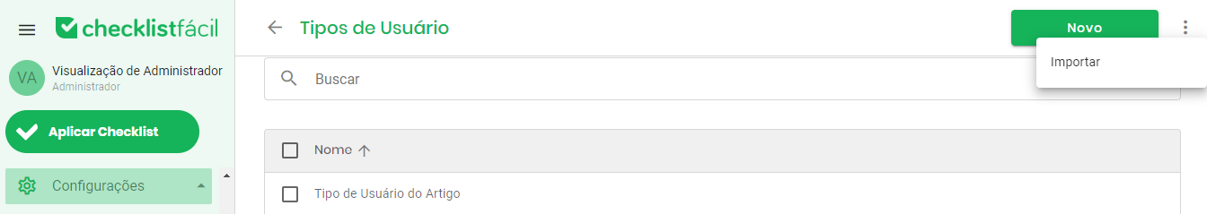 Acesse a tela de configurar tipos de usuário, clique nos três pontinhos ao lado do botão novo e selecione a opção importar.
