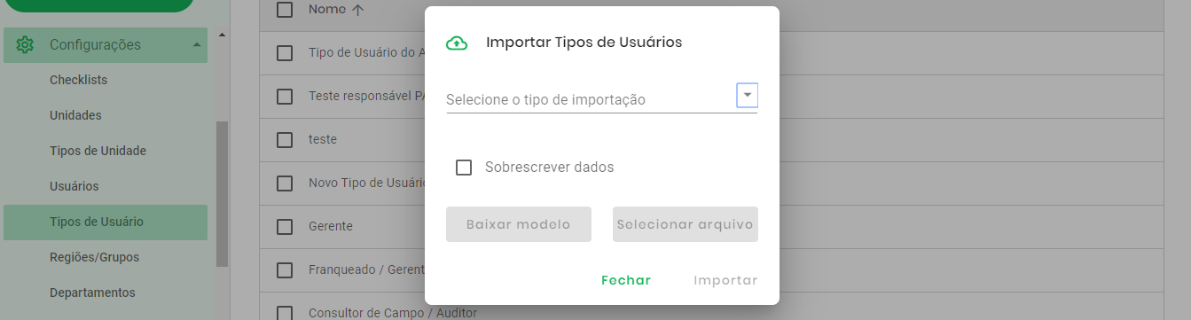 Ao marcar essa opção, caso o sistema identifique um tipo de usuário já existente, as informações da planilha substituirão as informações atuais no sistema.