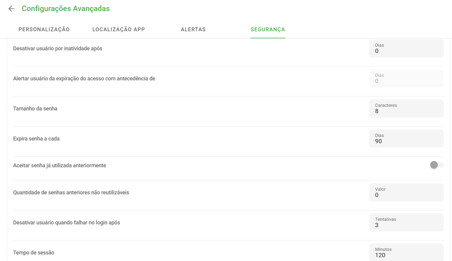 * Desativar usuário por inatividade após: se um usuário não acessar o sistema após a quantidade de dias configurado, seu acesso será desativado;