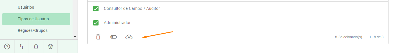Caso precise realizar uma alteração em vários registros simultaneamente, selecione os tipos de usuário desejados. As opções de ação em massa ficarão disponíveis automaticamente no rodapé da página.
