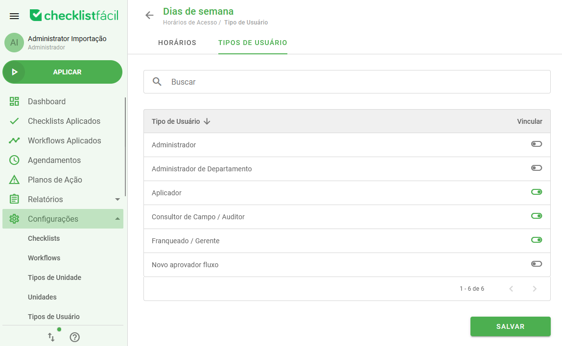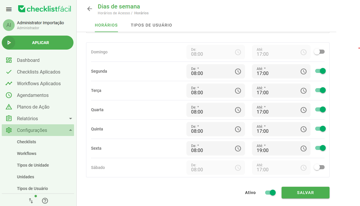 Usando a funcionalidade de Horários de Acesso, é possível configurar e limitar o acesso dos usuários ao sistema com base em dias e horários específicos. Essa é uma excelente forma de garantir a segurança e o cumprimento de jornadas de trabalho.