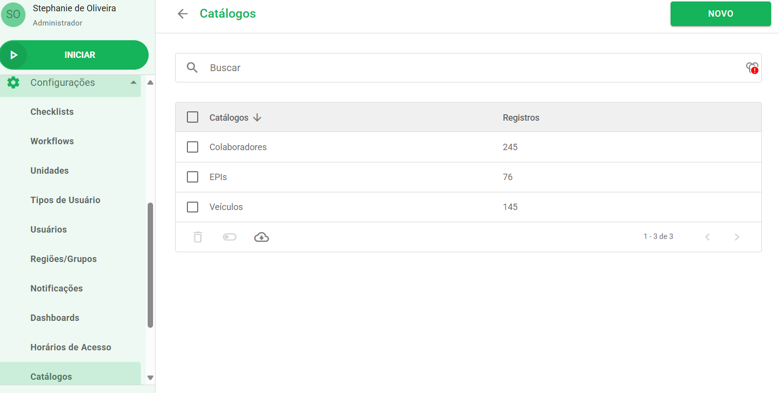 Acesse Configurações > Catálogos e clique em Novo para começar a catalogar os registros da sua operação.
