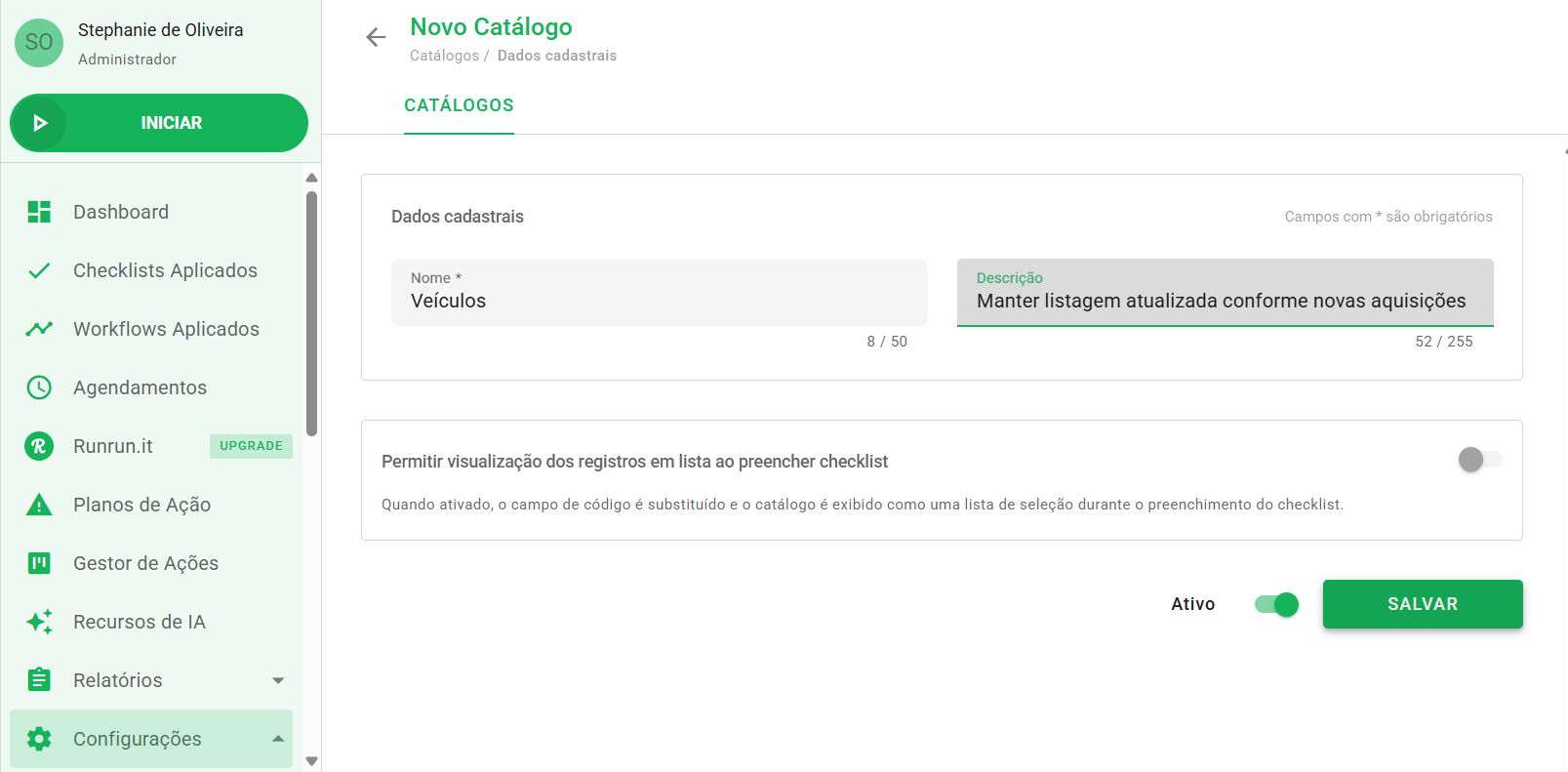Após preencher as informações, salve o formulário para começar a inserir os registros. Caso ainda não queira disponibilizar esse catálogo para as unidades, você pode mantê-lo inativo desmarcando o botão Ativo.