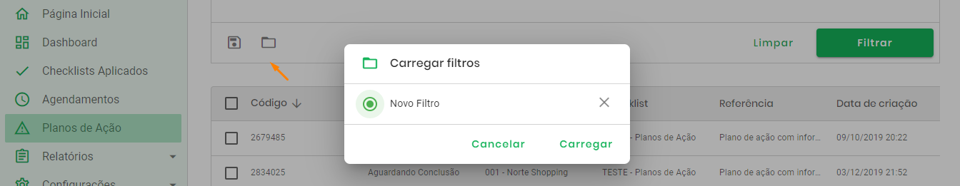 Depois de salvo, ele ficará disponível ao lado do botão anterior de salvar em uma pasta. Basta clicar nela e o sistema informará os filtros salvos. Para carregar um filtro, selecione o desejado e clique em Carregar.