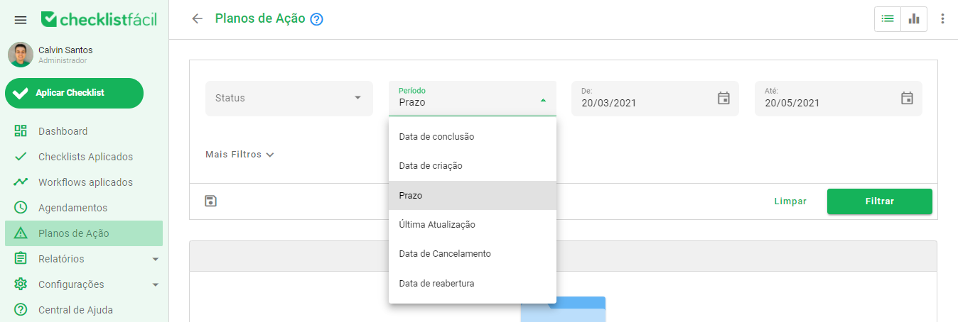 Na página de Planos de Ação, temos a opção de filtrar os PAs que desejamos localizar. Para começar, vamos entender mais detalhadamente o filtro por Período, e cada opção que ele traz.
