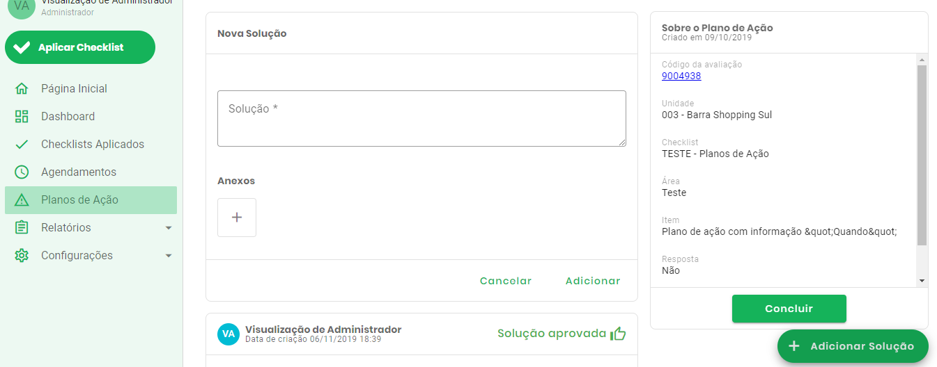 Para registrar o que foi feito para resolver a não conformidade, utilize o recurso de solução: