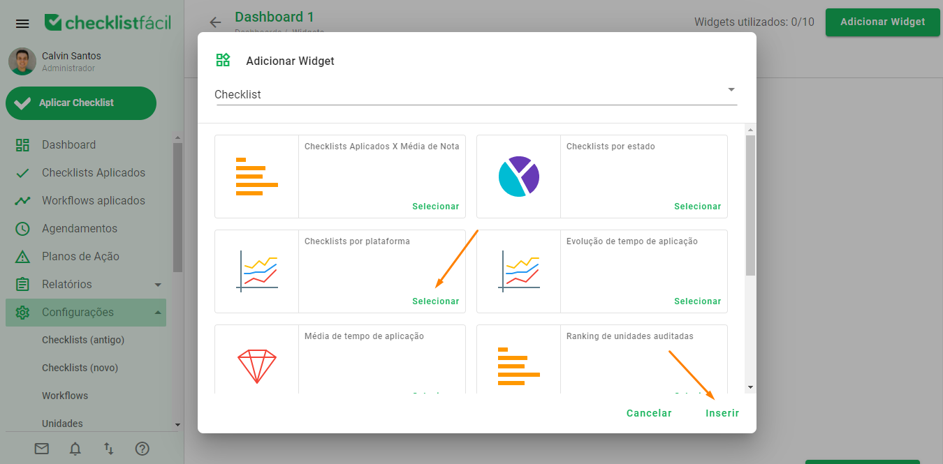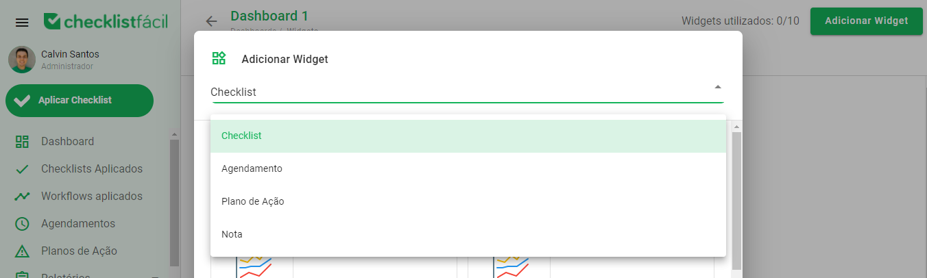 É possível escolher o tipo de Widget que será utilizado, classificando-o como: Checklist, Agendamento, Plano de Ação ou Nota.