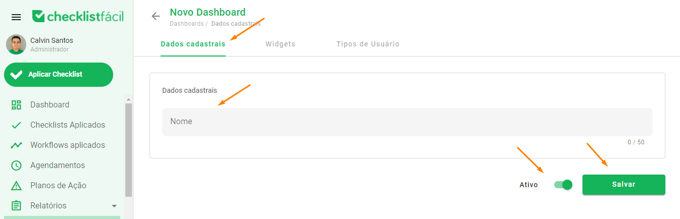 Após clicar em Novo, na opção Dados cadastrais, você pode escolher um nome para o Dashboard no campo Nome e clicar no botão Salvar. Também é possível definir se este Dashboard ficará ativo ou não utilizando o seletor de status.
