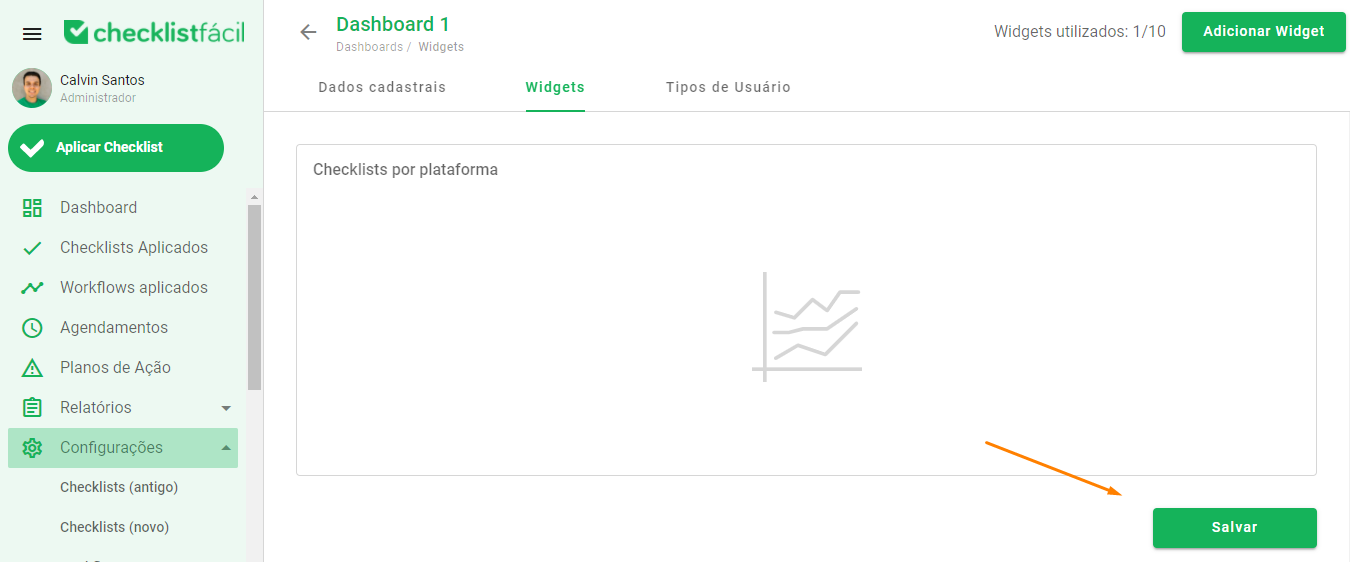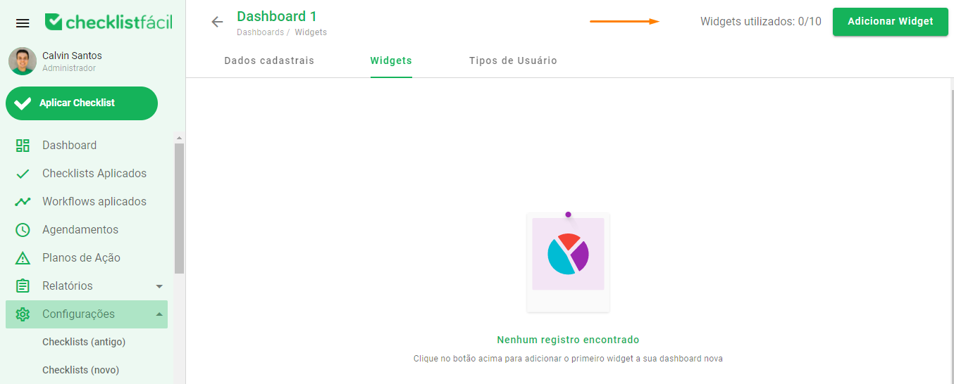 Na opção Widgets, você deve adicionar um modelo clicando no botão Adicionar Widget, localizado no canto superior direito.