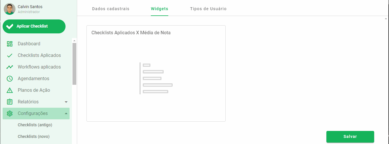 Caso precise configurar as informações que aparecem no Widget, clique no ícone de lápis (Editar). Você poderá ajustar o nome, o período, as unidades e os checklists que compõem os dados.