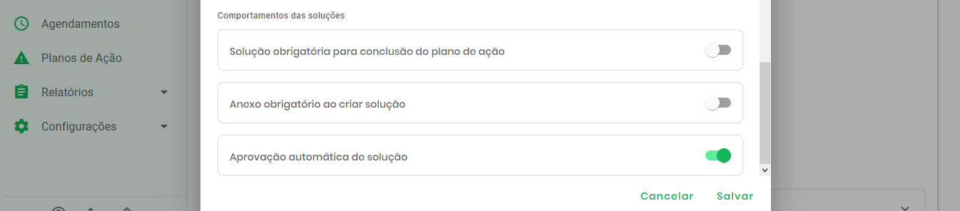 Estes parâmetros controlam as exigências para o fechamento das tratativas, como a solução obrigatória, a necessidade de anexo obrigatório ao criar uma solução e a aprovação automática.