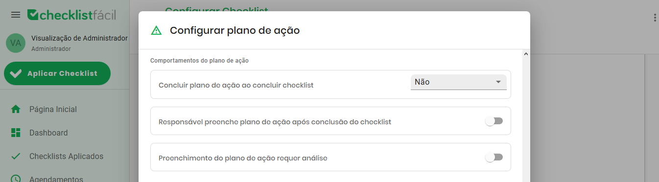 Ao configurar os comportamentos, você define o fluxo de trabalho do plano. É possível determinar se o PA deve ser concluído junto com a aplicação do checklist, se o preenchimento deve ser feito por um responsável após a conclusão, ou se o conteúdo deve passar por uma análise.