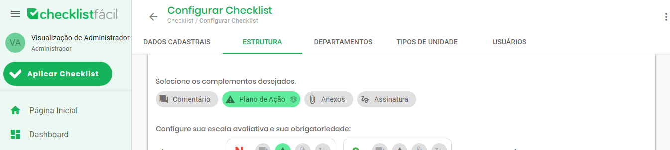 Na aba de estrutura da configuração de um checklist, ao expandir um item, você pode habilitar o complemento plano de ação. Para configurar as regras do PA, clique no ícone de engrenagem (configurar) localizado no botão do complemento.