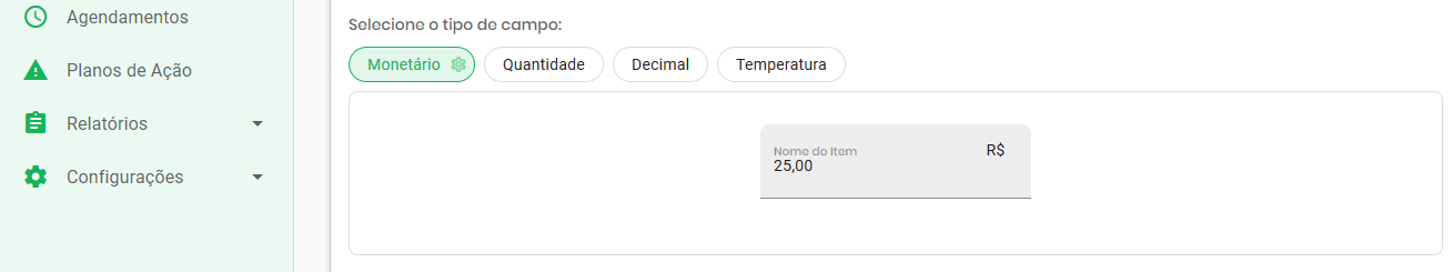 O tipo numérico permite definir o formato em que o valor será inserido. As opções variam desde quantidade, valor decimal, temperatura, até monetário (com possibilidade de ajustar a moeda).
