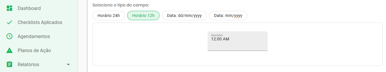 O tipo data permite que seja selecionado um valor respeitando o padrão selecionado no tipo de campo (ex: Data e Hora, Só Data, Só Hora).
